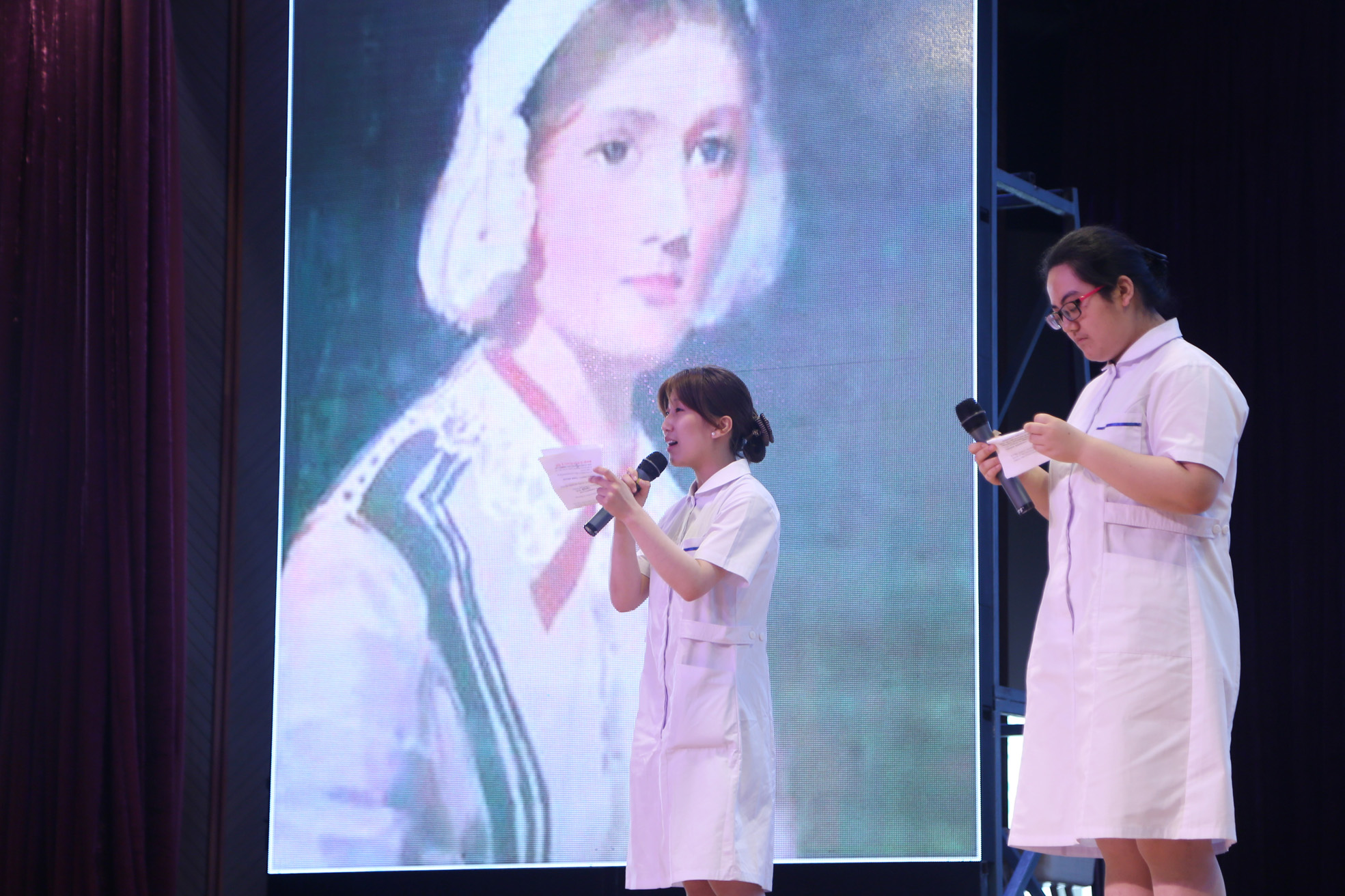 护理6班的张卓媛和王文锦用《致青春》和视频回顾了同学们的校园生活;护理1班的应语晨和4班的王蓓在《赞美你白衣天使》表演中,用质朴的语言表述了同学们致力于救死扶伤、无私奉献的医护事业的决心。