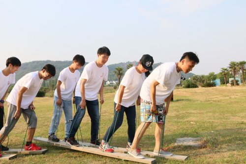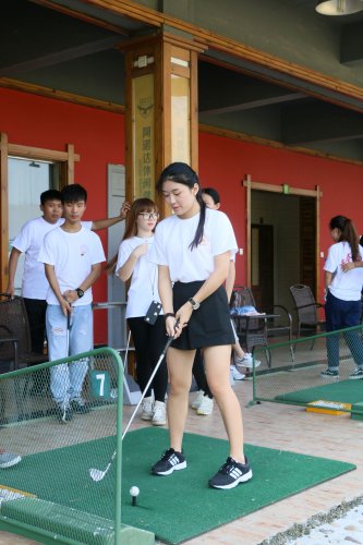 活动第一天,主要进行了高尔夫、攀岩、划船、射箭和团体大脚板等五项活动。同学们分组之后首先进行的是划船,换上救生衣两两一组,开始大家都没有经验,很多组的小船在原地打转,很快就有同学掌握了技巧,如何把小船顺利往前划而不会摇晃,熟练的同学纷纷向大家分享经验。
