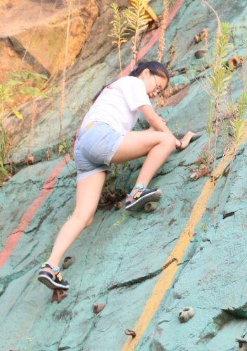 攀岩过程中,老师怕女生体力不够,让她们稍微爬一段感受一下就可以下来,但我们的“娘子军”几乎每个人都努力爬到了顶峰。让人感动的是,男生们都自觉站在岩面的最下方,为女生们架起保护屏障,并告诉他们自己爬过的经验,例如哪块岩石较小或哪块有些松动千万不能踩。