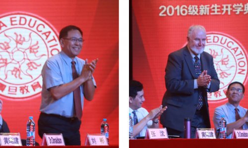 陈力华院长在讲话中首先回顾了震旦老前辈马相伯先生在1903年前后创立震旦的光辉历程,以及张惠莉主任秉承震旦“崇尚科学、注重文艺、不讲教礼”校训,从1984年办学到至今,终将震旦办成从学前教育到终身教育的教育集团,开创了上海民办教育的先例。陈院长说:震旦学院是上海市的文明单位,学院毕业生的就业率一直保持在98%以上,2016年达到了99.4%,名列上海市民办高校的前茅。学院2016年新生共1635名,分别来自全国21个省市,在此我表示热烈的欢迎和衷心的祝贺!陈院长针对2016级新生将迎接新的学习和生活,向他们建议:首先要培养自己好的记忆,现在每个新生都有自己的专业,因此要确立专攻方向,学好专业理论,突出专业实践,精通一到几门的技能,切实成为能适应社会、生产和管理的高技能人才;其次要锻炼好身体,只有身体好才能终身幸福,每天锻炼1小时,即可幸福工作50年,因此我们要锻炼好身体,为自己的终身幸福打好基础;再次要塑造好的品行,这是我们的终身灵魂,不管如何,我们一定要坚守道德的底线。践行社会主义核心价值观,要从点滴做起,要从遵守校纪校规做起,这才能锻炼自己、奋发向上!