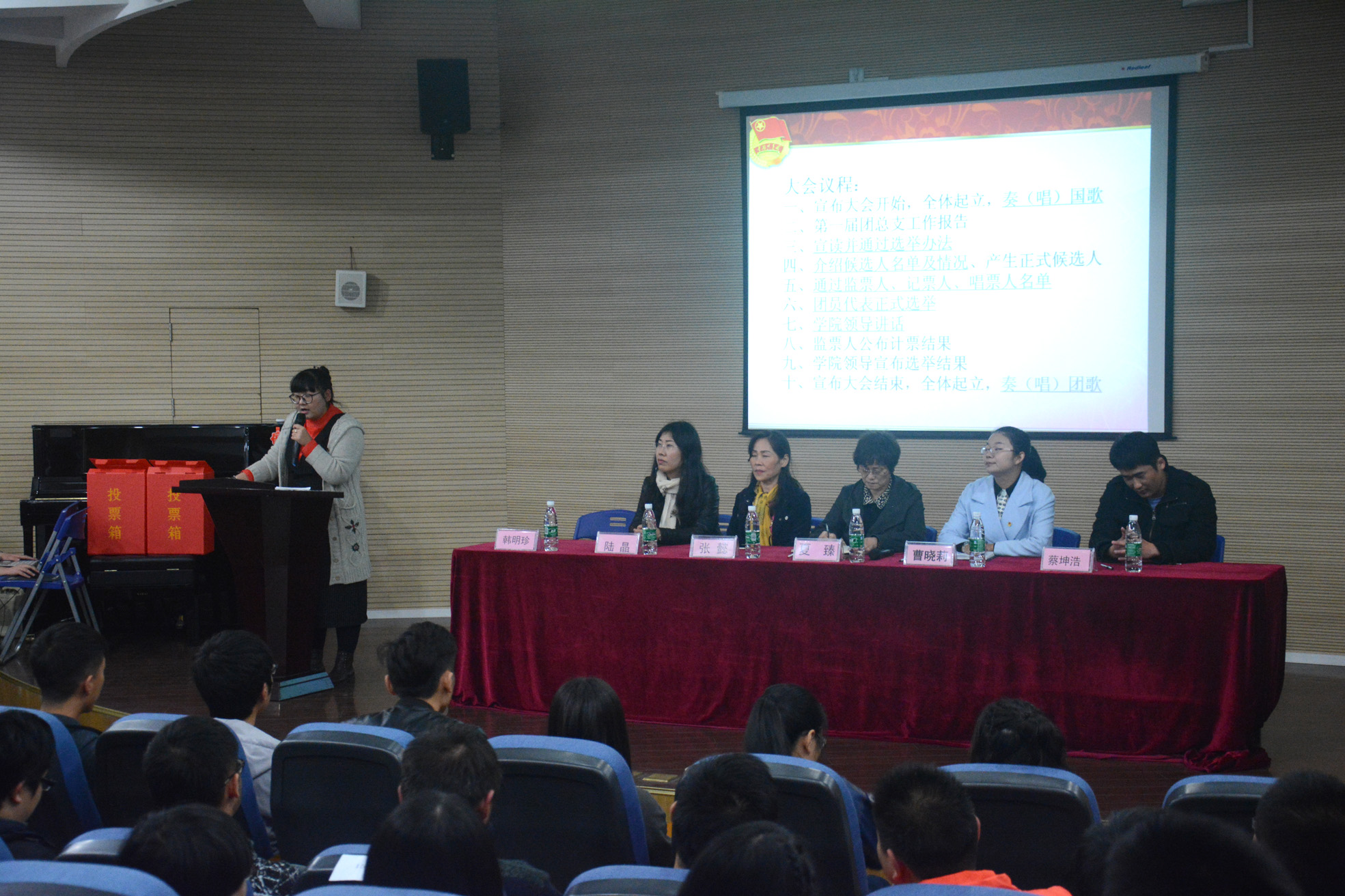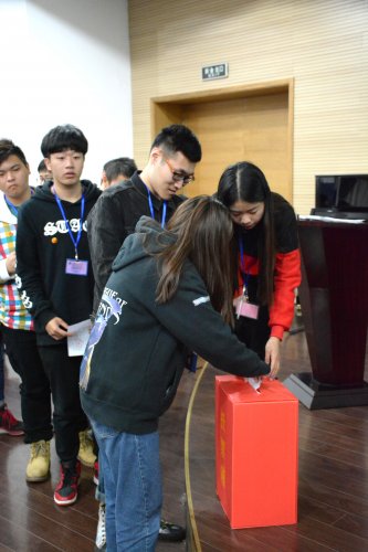 会议第三项议程是宣读并通过《选举办法草案》,会场人员一致通过选举办法。接下来是武老师介绍团总支委员候选人情况,候选人一一起立。在推举通过监票人、计票人名单后,大会选举正式开始。团代表们填写选票并进行投票。