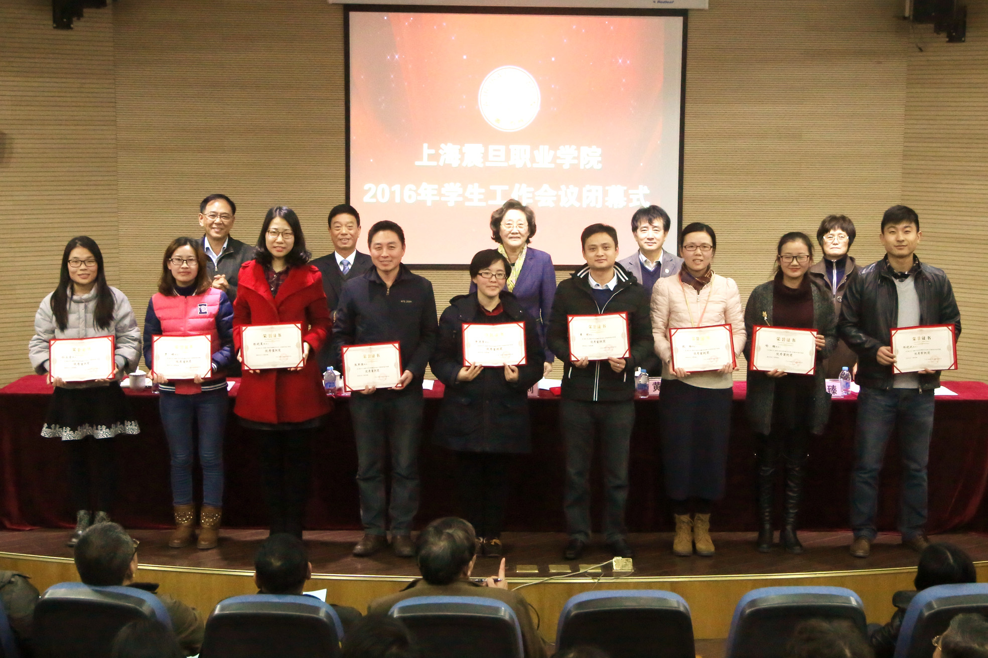 在2016年上海震旦职业学院学生工作闭幕式上,校领导为获奖人员授奖。
