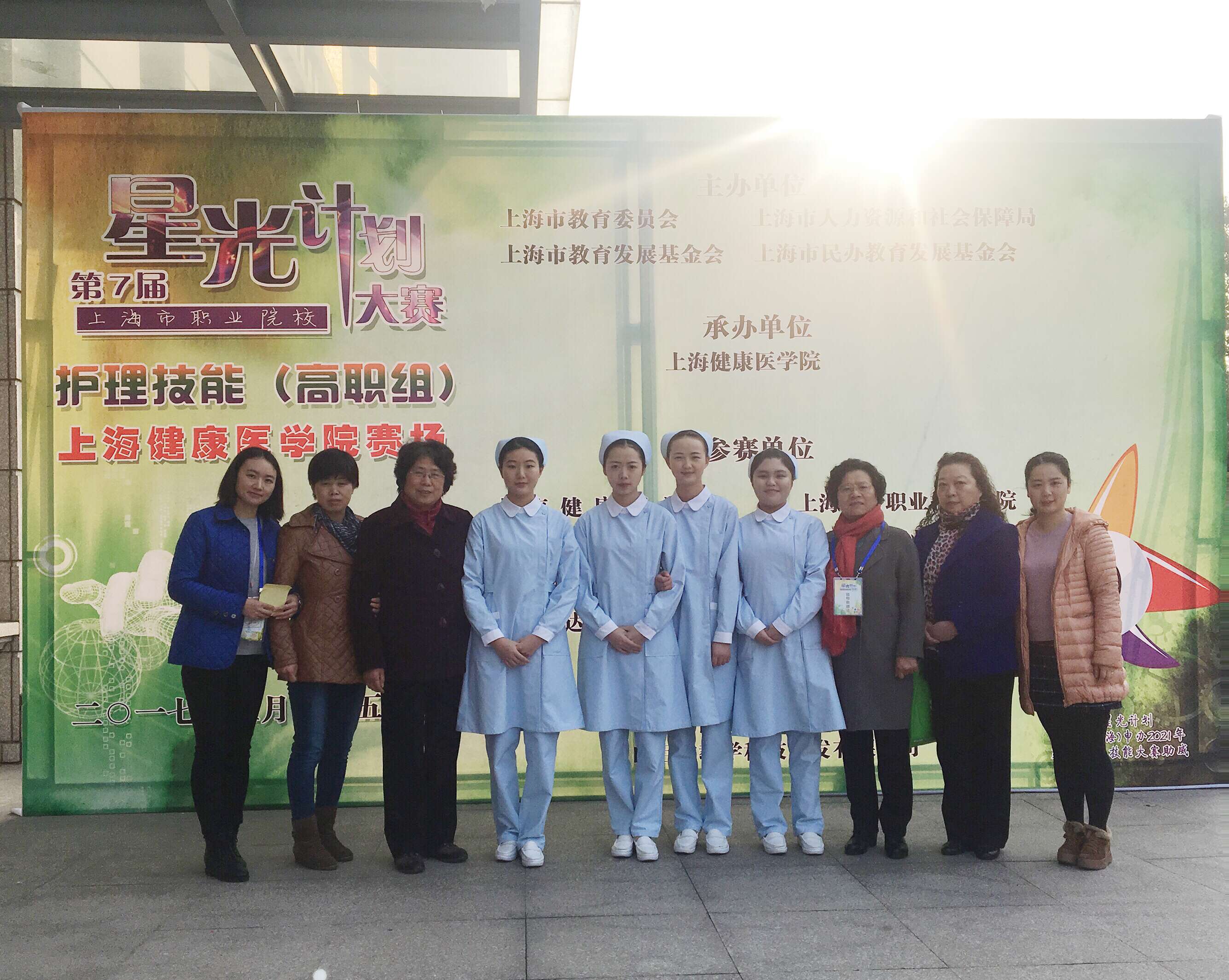 3月25日,第七届上海星光杯护理技能(高职组)比赛在上海健康医学院隆重举行。我校公共卫生与护理学院2015级杨懿、王文婷、黄钰菁、丁颖菁4位同学参加了此次比赛,公共卫生与护理学院赵佩君院长、实践办主任叶素梅老师和护理专业主任吴景芳老师亲自带队,指导老师杨玉亭、朱成慧、黄欢老师全程陪同,给予参赛选手莫大的鼓舞和信心。