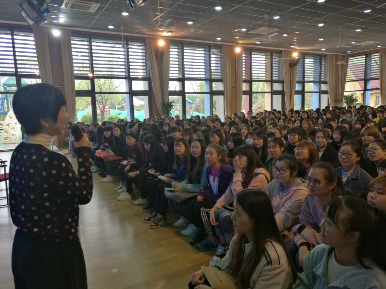 最后,师生们有序进入园内多功能厅,听取了中福会幼儿园组织的“幼儿园一日生活组织安排”专题讲座。在凤炜园长致简短的欢迎词后,副园长董炎老师向我院师生介绍了二期课改后的幼儿园一日活动安排和相应的园内设计,并重点介绍运动板块在保证幼儿安全的同时进行创新的项目及配套设施,不禁让人耳目一新,豁然开朗。此外,为达到幼儿基本动作发展、身体素质、运动核心经验等教学预期目标,老师们所做的相应教学设计等工作,让我院师生受益匪浅。讲座结束后,董炎园长对我院本次的观摩活动的组织安排及现场协调工作给予了高度的肯定,并向我院学生表达了为幼儿教育事业共同奋斗的美好期望和祝愿。我院钱源伟院长也对中福会幼儿园为此次活动所做的接待与配合表示了诚挚感谢,并期待日后有更多的专业合作。