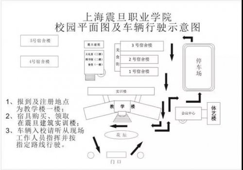开 学 必 备 证件材料: 1.录取通知书原件; 2.身份证原件、身份证正反面复印件四份(复印件交辅导员),学校将统一为新生办理银行卡; 3.一寸近期证件照6张,每张后面写上姓名及专业; 4.学生个人纸质档案;团员请带团员证;外地新生转党组织关系转到“中共上海市教育卫生工作委员会”; 5.通过银行汇款的同学带上汇款凭证(收据遗失的同学可以去财务处开具相关证明,学校财务处电话:021-66863277); 6.非上海户籍新生户口迁入学校的同学户口迁移证等相关材料,在军训结束返校后,由辅导员老师按照班级统一收。相关材料包括户口迁移证+身份证复印件(背面写好班级+手机号)+录取通知书复印件。具体返校后再作通知。户口迁移证有时间限制,过时不办理,后果自负。(学校保卫处/武装部电话:021-66866907或66863366*8110)。 生活用品: 为更好地服务同学,报到当天学校请“上海高校后勤服务有限公司”现场供应宿具。根据“自愿”原则,同学们可在报到时根据自身实际需要,用现金购买整套宿具。学生宿具由上海高校后勤服务有限公司通过公开招商统一配售,上海质量技术监督局批量检验合格。宿具费:520元/套。 关于军训: 1、时间:2017年8月29日— 2017年9月7日 2、地点:昆山安博实训基地(在江苏,小萌新们注意手机话费余额和流量余额) 3、军训时需带:皮带、跑鞋、外套、换洗衣服(军训营地切勿携带贵重物品) 报到修炼手册 报到地址: 上海震旦职业学院(校本部)(上海市宝山区市一路88号) 报到时间: 非上海户籍同学:2017年8月27日 (星期日)上午9:00—下午15:00(报到后即入住宿舍)。 上海户籍同学:2017年8月28日 (星期一)上午9:00—下午15:00(报到后即入住宿舍)。 来校交通: 1、上海火车站、上海火车南站、上海长途汽车总站至学院交通: 乘坐地铁3号线至镇坪路转乘地铁7号线至罗南新村站(1号口出站),换乘宝山23路到市一路集贤路站,或地铁7号线至美兰湖站(1号口出),打车约起步价至学校。 2、上海虹桥机场、上海虹桥火车站、上海浦东机场至学院交通: 乘坐地铁2号线至静安寺站转乘地铁7号线至罗南新村站(1号口出站),换乘宝山23路到市一路集贤路站,或地铁7号线至美兰湖站(1号口出),打车约起步价至学校。 学校平面图: 报到流程: 新生家长会: 家长会地点和家长休息室都设在1号楼109教室,8月27日10:30-11:30,14:00-15:00;8月28日10:30-11:30。新生家长会后安排各二级学院的新生家长接待会。 具体安排:教育学院1-303教室,传媒艺术学院1-304教室,经济管理学院 1-305教室,东方电影学院 1-306教室,机电工程学院 1-308教室, 公共卫生与护理学院1-109教室。 学校住宿: 女生1号、2号宿舍楼,男生4号楼。教育学院、传媒艺术学院、经济管理学院、东方电影学院、公共卫生与护理学院、机电工程学院(建筑专业),校本部(市一路88号)住宿条件:4人1间,有空调、卫生、热水沐浴;机电工程学院(除建筑专业)美兰湖校区(月罗公路2106号)住宿条件:6人1间,有空调、2卫生、热水沐浴。