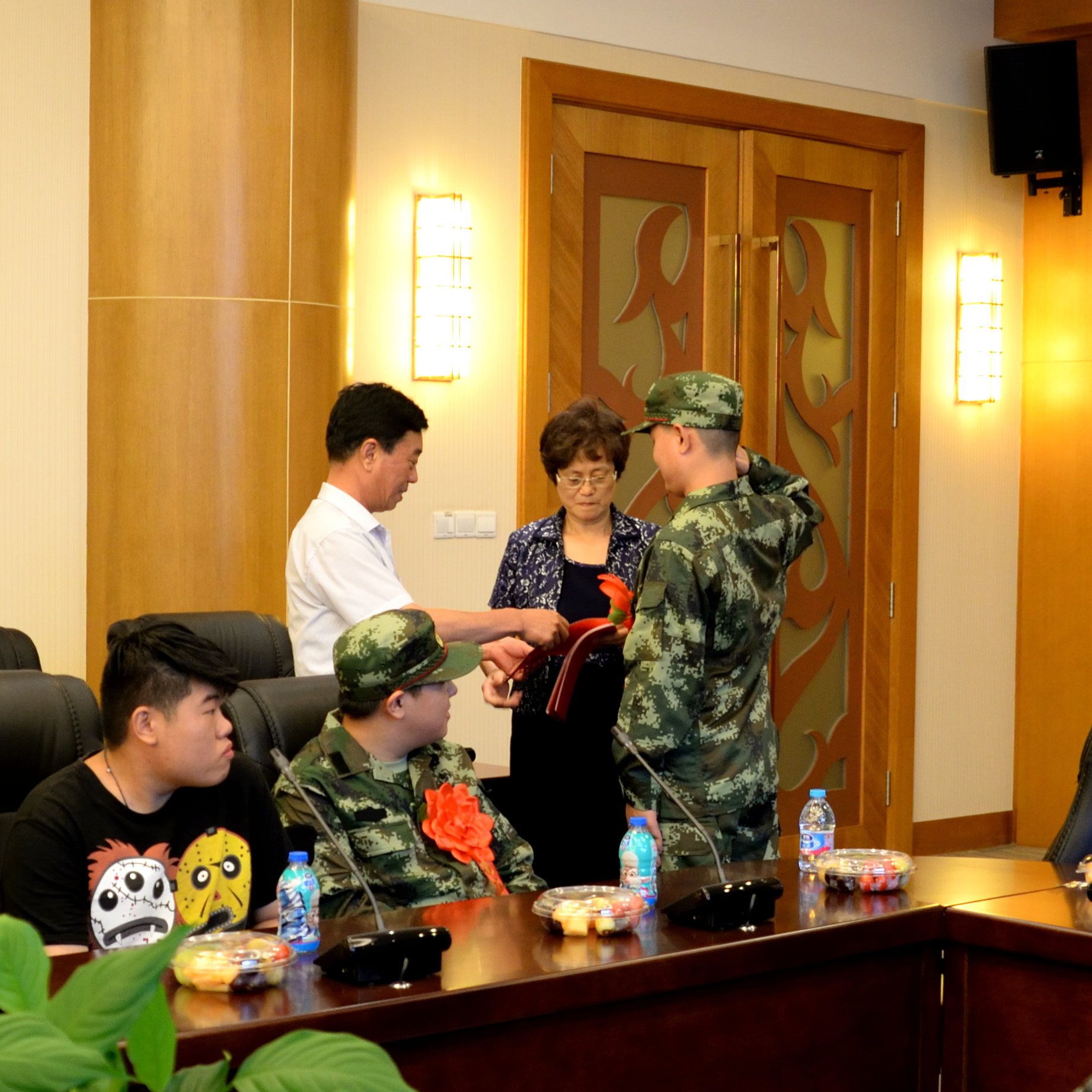 会上,武装部部长孙兴强同志首先介绍了我校今年征兵工作开展的基本情况,同时宣读了2017年我院新兵名单、去向以及各兵种的集结时间。随后,陈力华校长和夏臻副书记亲自向每位新兵同志颁发入伍通知书。同时学院党政领导、武装部、学生处领导们又向新兵赠送纪念品并送上美好祝愿。