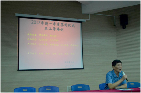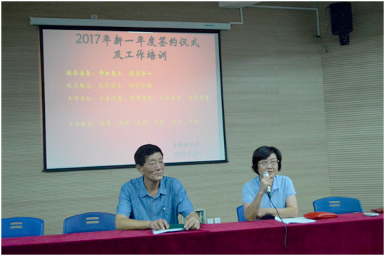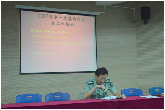 2017年9月20日下午,后保处在体艺楼报告厅召开2017年度新一轮员工签约仪式暨专业培训。校长助理、分管校领导张佩莉同志、后保处处长孙兴强同志,以及后勤全体员工参加本次签约仪式。