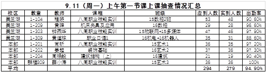 9月11日上午2017-2018学年第一学期正式开学,清晨,领导和老师们就早早地来到了学校做开学的准备工作,迎接新老同学入学;2015级、2016级的同学们也是早早地等候在教室,等待8.30分正式开课。8.20分学校和有关部处领导们就聚集在会议室,铃响后张理事长、张沈董事长、陈校长、黄书记、夏书记就带领有关部处领导,分四路深入校本部和美兰湖校区,到教室、实验室检查开学第一节课的上课情况,从检查的结果来看,总体上教学秩序井然、课堂纪律良好,老师负责,学生认真,比上学期有显著进步。具体体现在一是老师们全勤准时上岗,备课充分、认真施教,没有发现老师迟到等违纪现象;二是学生们经过一个暑假的休息调整,精神面貌焕然一新,出勤率及纪律都比上学期有明显提高,平均出勤率在94.9%(详见下表);