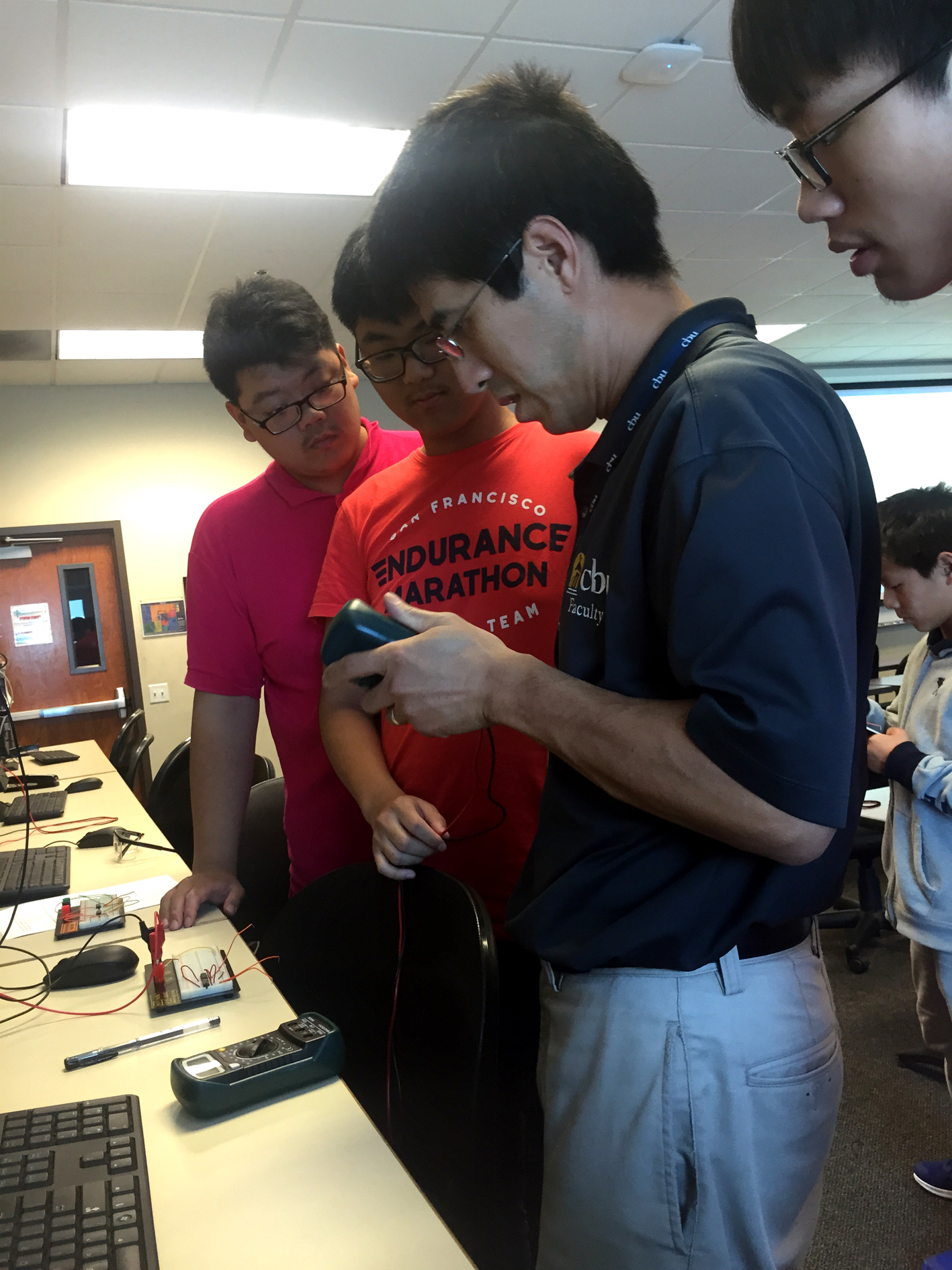 2017年7月6日(中国时间),2016级物联网中美合作应用技术专业一行9位同学与一位带队老师,到美国加州浸会大学参加暑期夏令营。本次暑期夏令营课程项目为期4周,修读两门课程,分别是ESL课程和电子电路设计课程。 由于时间关系,故课程安排紧密,学习也是分紧张,但同学们依然精神满满完成了学习。 Pro.Marie教授ESL课程,主要从听、说、读、写四个方面授课。Pro.Marie在课堂上运用互动式的教学方法、活跃课堂气氛,不断鼓励同学们开口讲英文、拓宽思维,完成每天的课堂作业。同学们沉浸在全英文学习氛围中,起先有些不适应,几节课过后,大部分同学可以跟上课程节奏。课程结束时,同学们进行了英语分级测试,有的同学的测试结果已达到CBU国际学生英语入学标准。 Dr.Xu教授数字电路设计课程,课程主要包括课程讲座和实验两部分。课程中的专业英语词汇加大了课程难度。课程讲座部分,同学们会在课前做好充分准备,查好专业词汇;课下完成家庭作业时,也会互相帮助完成。实验部分是同学们最感兴趣的部分,可以使用实验器材,搭建复杂的电路,运用软件对电路进行编译。尽管实验过程中会出现报错的情况,甚至可能会反复出现,同学们在Dr.Xu和Tutor的帮助下一步步操作,完成实验。最后的课程期末考试中,两位同学获得A的好成绩,其余同学也都全部通过。 为了让同学们能更深切的体验美国本土文化,浸会大学国际中心还为同学们安排了家庭住宿和加州名胜的实地考察。期间,工程学院院长Dr.Donaldson和曾经来我校授课的Dr.Foist,邀请带队老师和同学们到家中做客。 夏令营时间虽短暂,却成为同学们一生中难忘的记忆。 供稿:陆晶 审核:胡克文