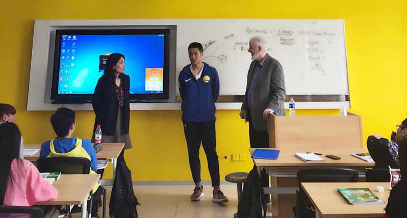 在课堂上,Dr. Donaldson首先向同学们做了简短的自我介绍,随即邀请全班同学上台用英语做口头展示,并就国际课程学习情况和学习动机等问题进行了现场交流。随后,Dr. Donaldson进一步指出,保持对学习的专注,发扬团队合作精神是大学成功学习的重要因素。最后,他预祝同学们学业有成。