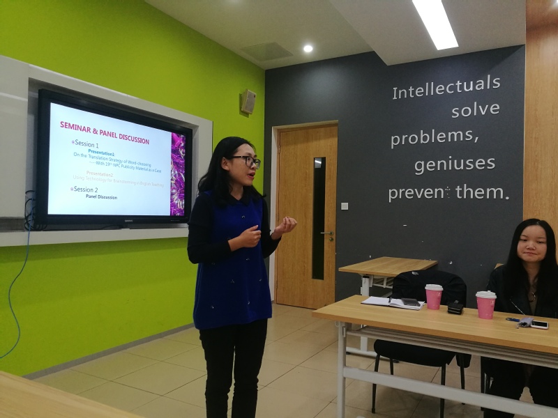 本次教学研共同体活动按国际化的学术研讨会模式,营造了全英文的研讨氛围。首先,以学术研究的角度解读“十九大”报告,创新了思政学习模式。基于平行语料库理论架构,袁琨老师作了报告:On the Translation Strategy of Word-choosing----With 19th NPC Publicity Material as a Case(“十九大”外宣材料的选词策略)。各位老师都获益匪浅,既进行了英语专业学术研讨,也学习了“十九大”报告。