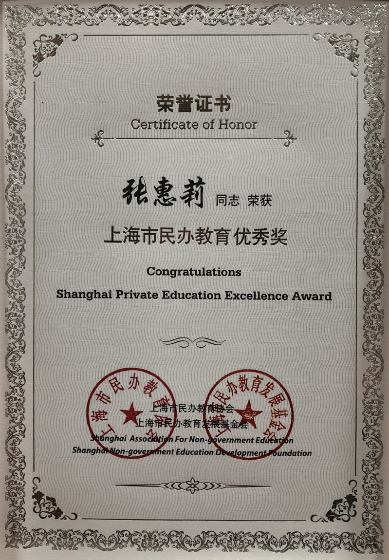 12月26日下午,震旦教育集团管委会张惠莉主任在上海市第三次民办教育工作会议上荣获“上海市民办教育优秀奖”。