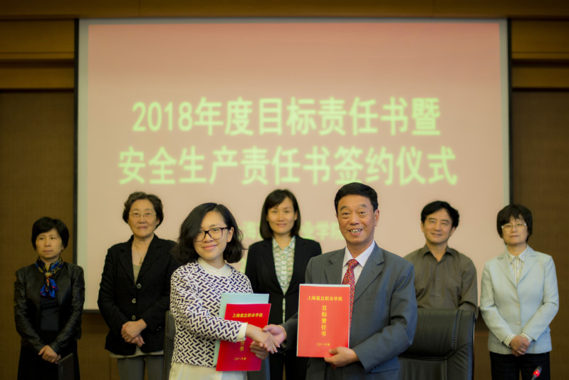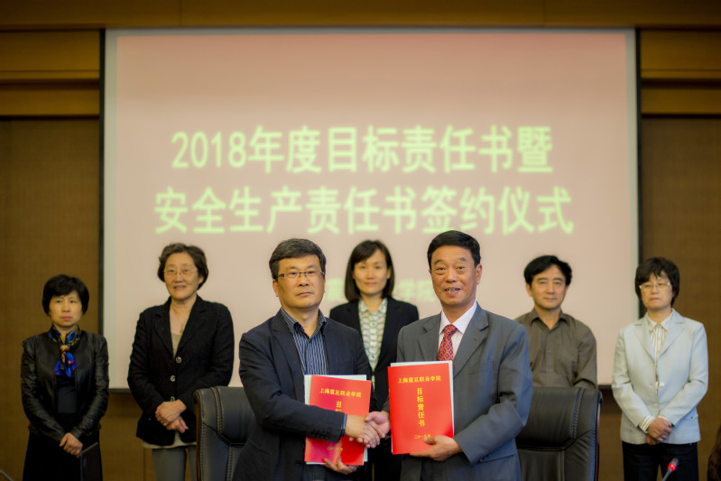 陈力华校长与各二级学院院长、机关科室负责人签订责任目标书,黄晞建书记与党委各部门签订责任目标书。