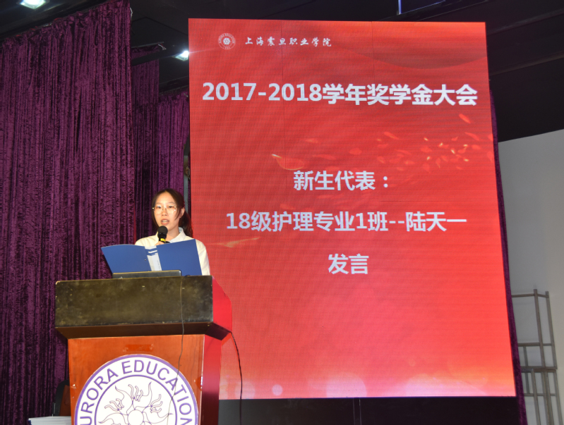18级护理1班的陆天一同学代表18级新生发言。她说,大学生活是一个人成长过程中最特殊的一段时期,它满载青春和回忆,彰显了辉煌的前程,作为当代青年,要继承光荣传统,牢记时代使命,以青春之我、奋斗之我,为民族复兴铺路架桥,为祖国建设添砖加瓦。