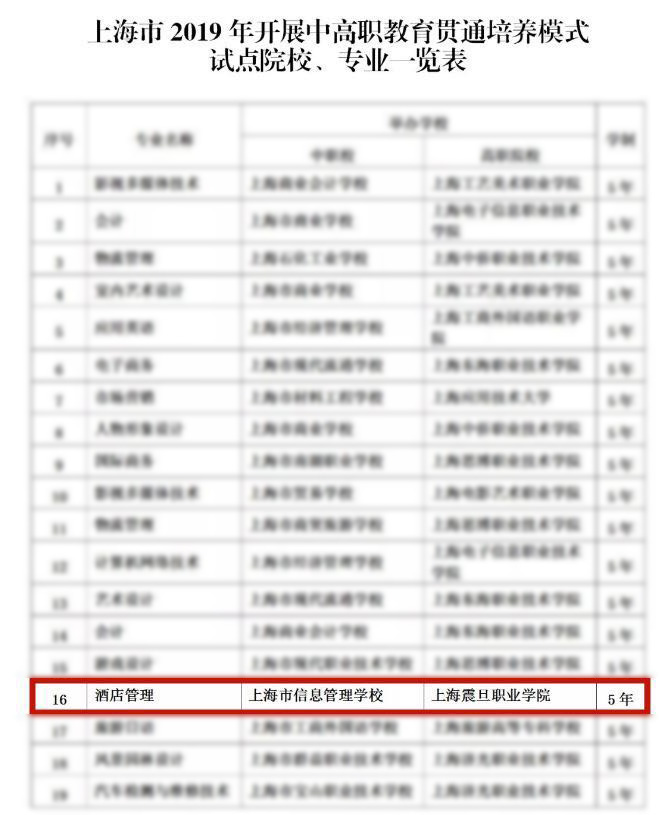近日,上海市教委下达《关于2019年增设26个专业点开展中高职教育贯通培养模式试点工作的批复》(沪教委职〔2019〕14号),我校与上海市信息管理学校联合申报的酒店管理专业获批。