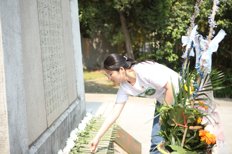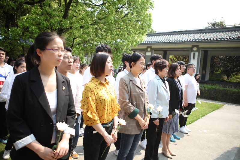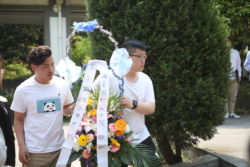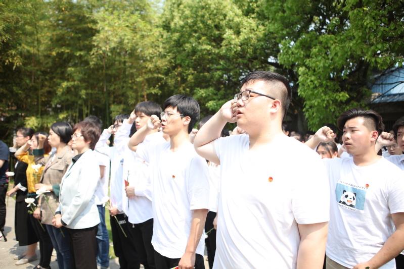 随后,全体团员在庄严肃穆的音乐中向革命烈士敬献花篮、向革命烈士三鞠躬并列队依次向革命烈士献花。