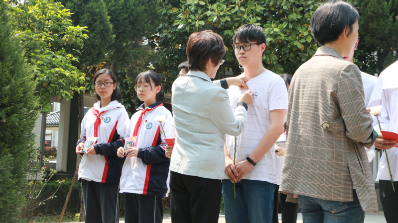 校党委副书记夏臻老师、罗店镇团委副书记周颖洁老师为新团员代表佩戴团徽,并由学生代表阮智勇带领新团员进行入团宣誓、老团员重温入团誓词。