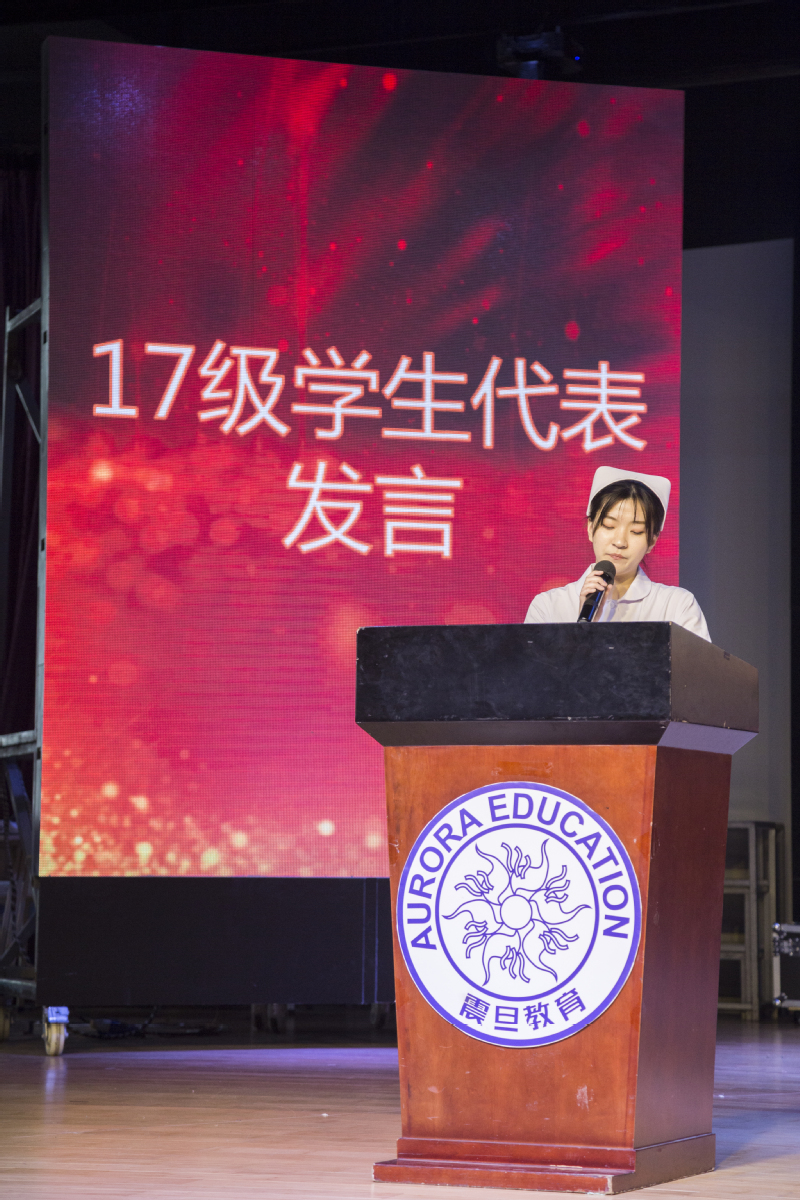 紧接着诗朗诵节目开始。我们坚信自己会一直发扬“燃烧自己,照亮别人”的南丁格尔精神!其后校长致词,表达了对护理学子们的殷切希望和深深祝福。17级学生代表17护理5班俞洁、17护理1班陈昱明依次发表讲话,发言内容:护理是一门强调动手能力的学科,临床操作十分重要,与病人的沟通、“三查七对”的原则是临床的重中之重,虚心求教是我们应该遵守的基本素养,“活到老,学到老”是我们的目标。在此,再次对引导、教导我们的老师表达由衷的感谢以及节日的祝福。