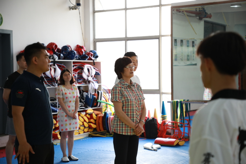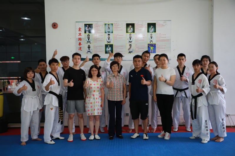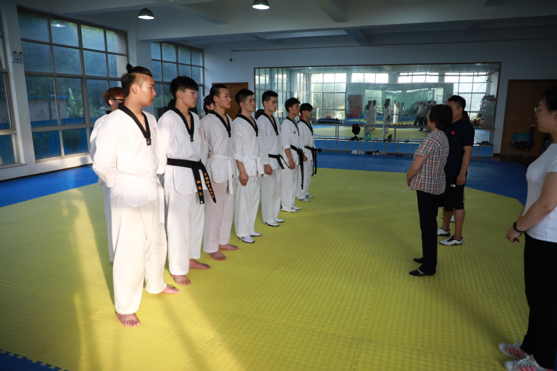 2019年6月5日下午五点半,就像几百个日常训练中的一天一样,体艺楼一楼外就能听到跆拳道队训练所发出的呐喊声和响亮的脚靶击打声。当天党委副书记夏臻老师,党委组织部部长黄敏老师,学生处处长毛燕静老师,前往跆拳道馆看望正在积极备战全国大学生跆拳道锦标赛的队员们。
