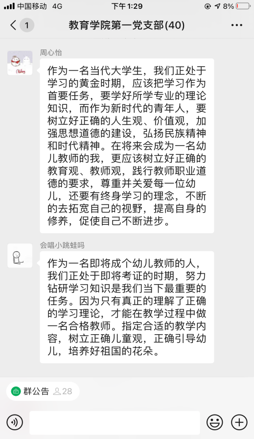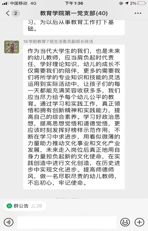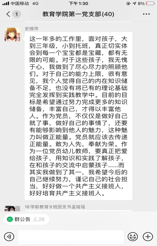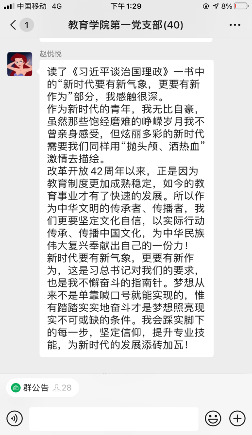 活动开始,党总支副书记杨彦琛同志带领全体党员认真学习《习近平谈治国理政》第三卷第一章节“谱写新时代中国特色社会主义新篇章”。大家围绕坚定文化自信,作为大学生党员、党员教师、幼儿教师,我们应该怎么做;新时代要有新气象,更要有新作为,作为青年人我们应该在“两个一百年”的历史交汇期能做些什么两个主题并结合自己的学习体会进行了研讨交流。