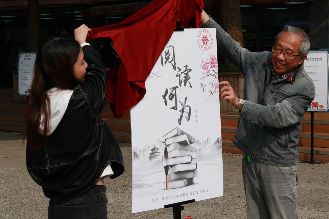 图书馆张健馆长和团委张雪琴老师共同为这次活动进行揭幕