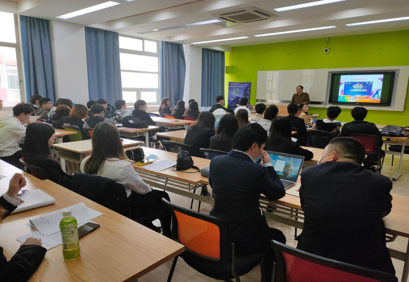 10月28号下午1:00,经济管理学院酒店管理专业携手上海绿地铂骊酒店、上海美兰湖酒店、上海外滩茂悦大酒店以及上海静安洲际酒店在一号楼305教室召开了18级酒店专业应届毕业生校园招聘宣讲会。会议先由各酒店负责人进行宣讲,之后直接现场面试。