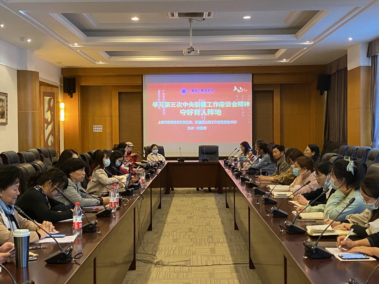 2020年11月13日下午13:00,由新疆驻上海工作组党委书记、上海市教委德育处副处长谢昌蓉主讲的《学习第三次中央新疆工作座谈会精神——守好育人阵地》讲座在我校体艺楼国际会议中心举行。副校长王纯玉、学生处处长曹晓莉、各学院院长、书记以及辅导员、教师代表出席了讲座。讲座由副校长王纯玉主持。