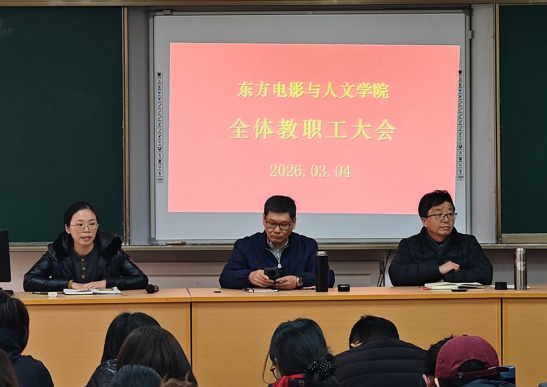 3月4日下午,东方电影与人文学院在1-209室召开全院教职工大会,围绕学院发展、学生工作、专业建设、教学与招生等核心任务,明确方向、细化举措,锚定AI时代影视艺术人才培养与产教融合高质量发展。大会由副院长祝华东主持。